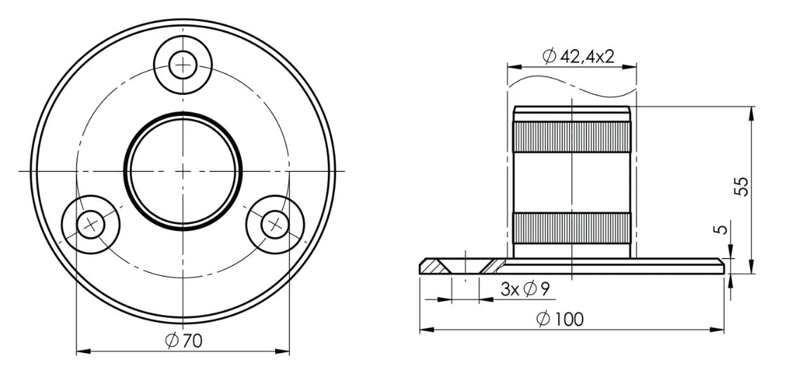 Flänsen för toppförankring av räckesstolpar ger stabilt stöd och säkerställer att stolpen sitter stadigt på plats. För förankring finns tre hål i flänsen som tillsammans med förankringsmaterial möjliggör fastsättning mot underlaget.