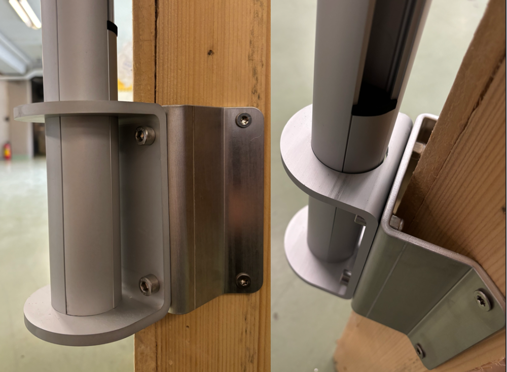 Stolpen skruvas med medföljande skruv i underkant stolpfot, dom fyra hålen i den bakre platta är till för infästning i bärlina/bjälklagskant.